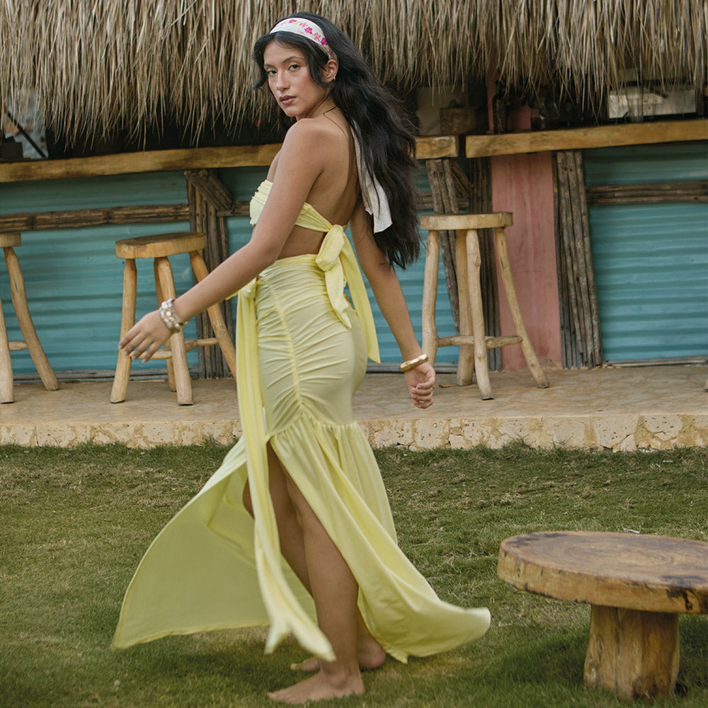 DISEÑO ENVOLVENTE QUE CELEBRA LAS CURVAS CON CORTES ESRATEGICOS. EL TOP CRUZADO EN ESCOTE HALTER...