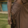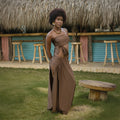 UNA FUSON DE LINEAS LIMPIA Y CORTES AUDACEZ. EL CORTE TIPO BANDEAU SE ANUDA AL COSTADO, REVELANDO UNA VERTURA LATERAL QUE ENMARCA LA ILUETA SON SENSUALIDAD; LA FALDA SE UNE CON UN JUEGO DE CORTES DIAGONALES QUE SEALZAN EL MOVIMIENTO
