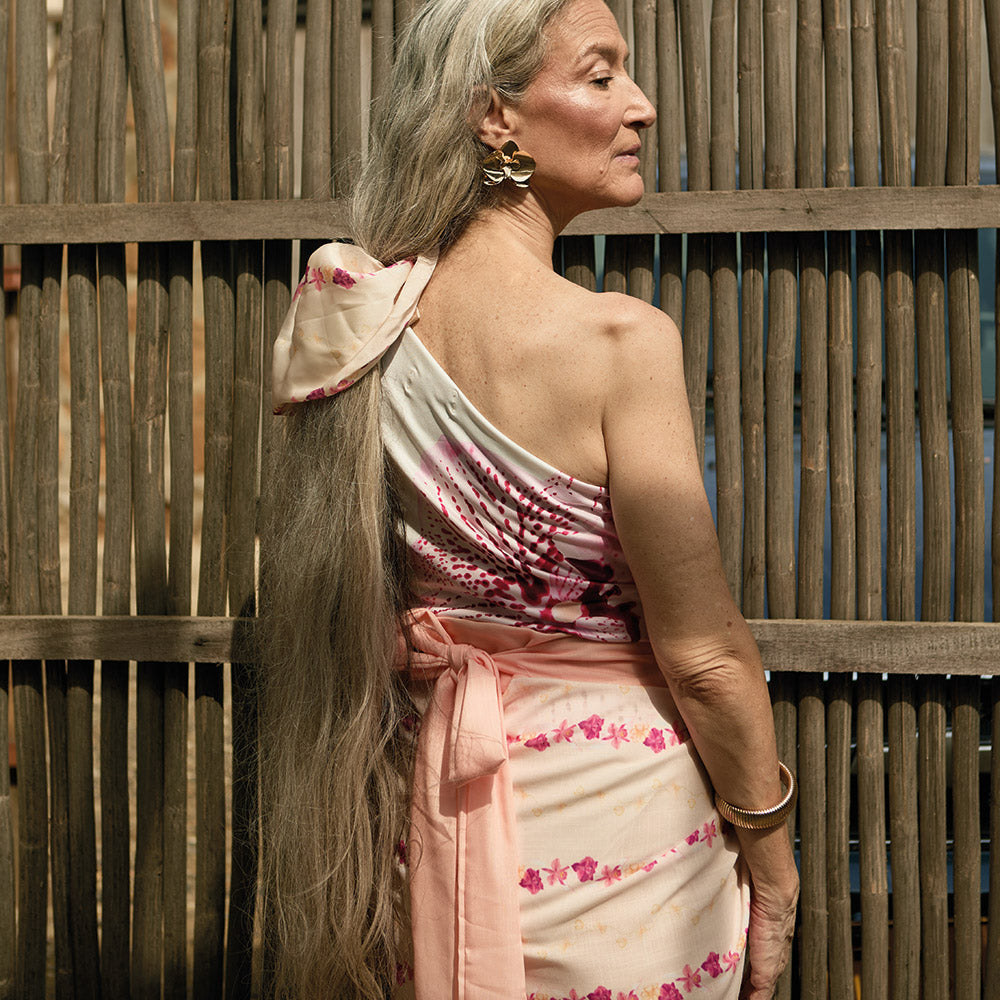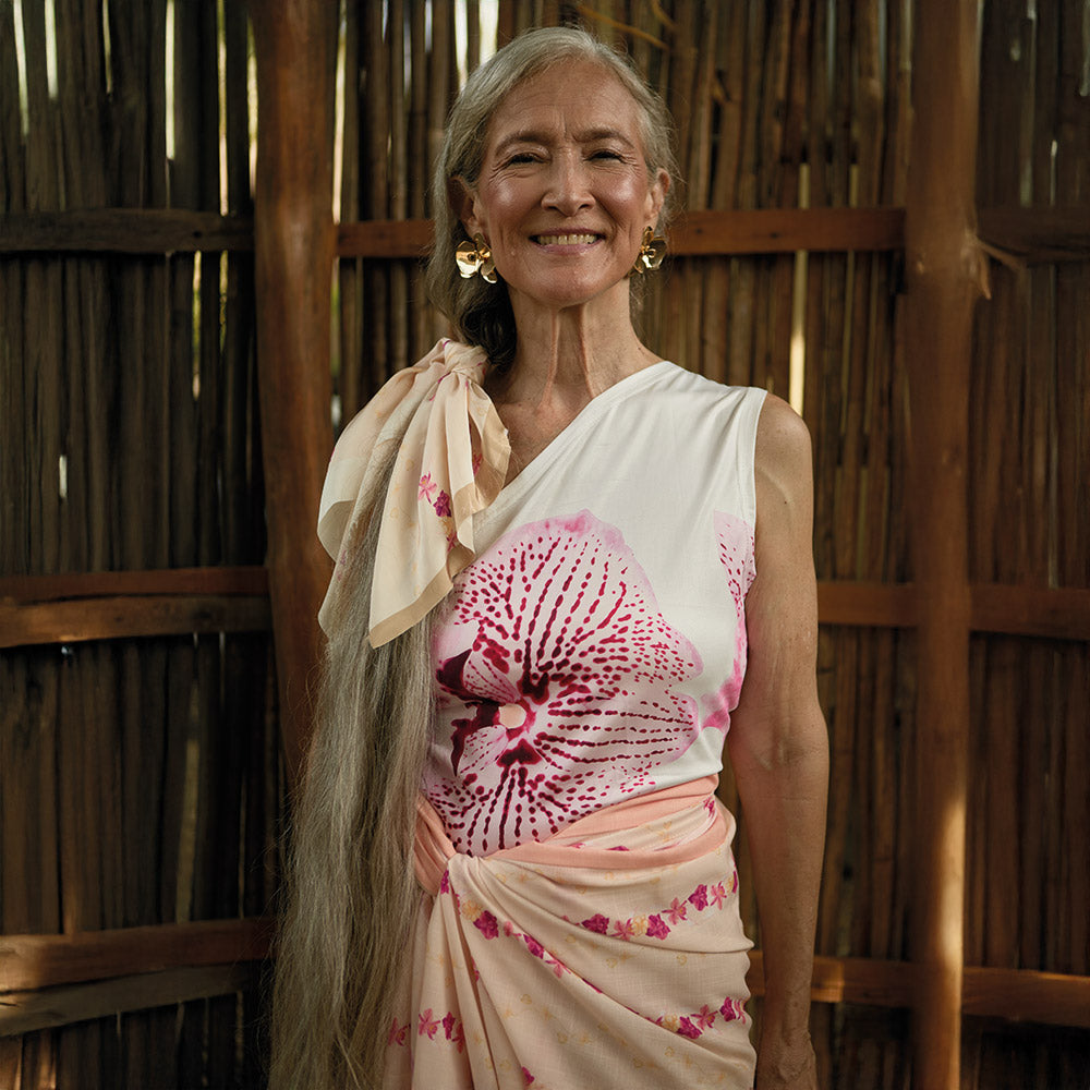 DISEÑO DE UN SOLO HOMBRO CON SILUETA FLUIDA Y FEMENINA. EL ESTAMPADO DE ORQUIDEA BOTANICA APORTA UN TOQUE DISTINTIVO Y NATURAL